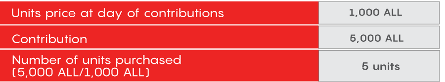 The unit price in an investment fund is calculated daily. Any purchase or repayment of units in the Fund will be made in Lek. The investor’s account value is calculated by multiplying by the number of his units at the unit price.