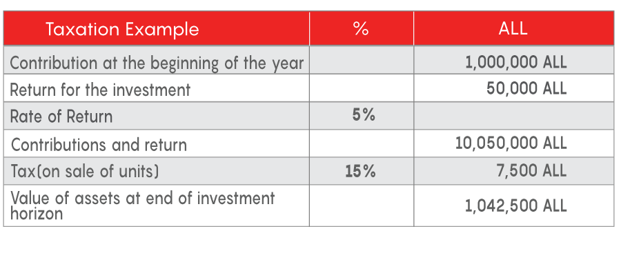 By the sale of units, the investor must be subject to income tax. Taxation of the Fund is based on Law no. 8438, dated 28.12.1998 “On income tax” amended, as well as the by laws issued in its implementation. The investor is taxed only for the value added to the contributions.